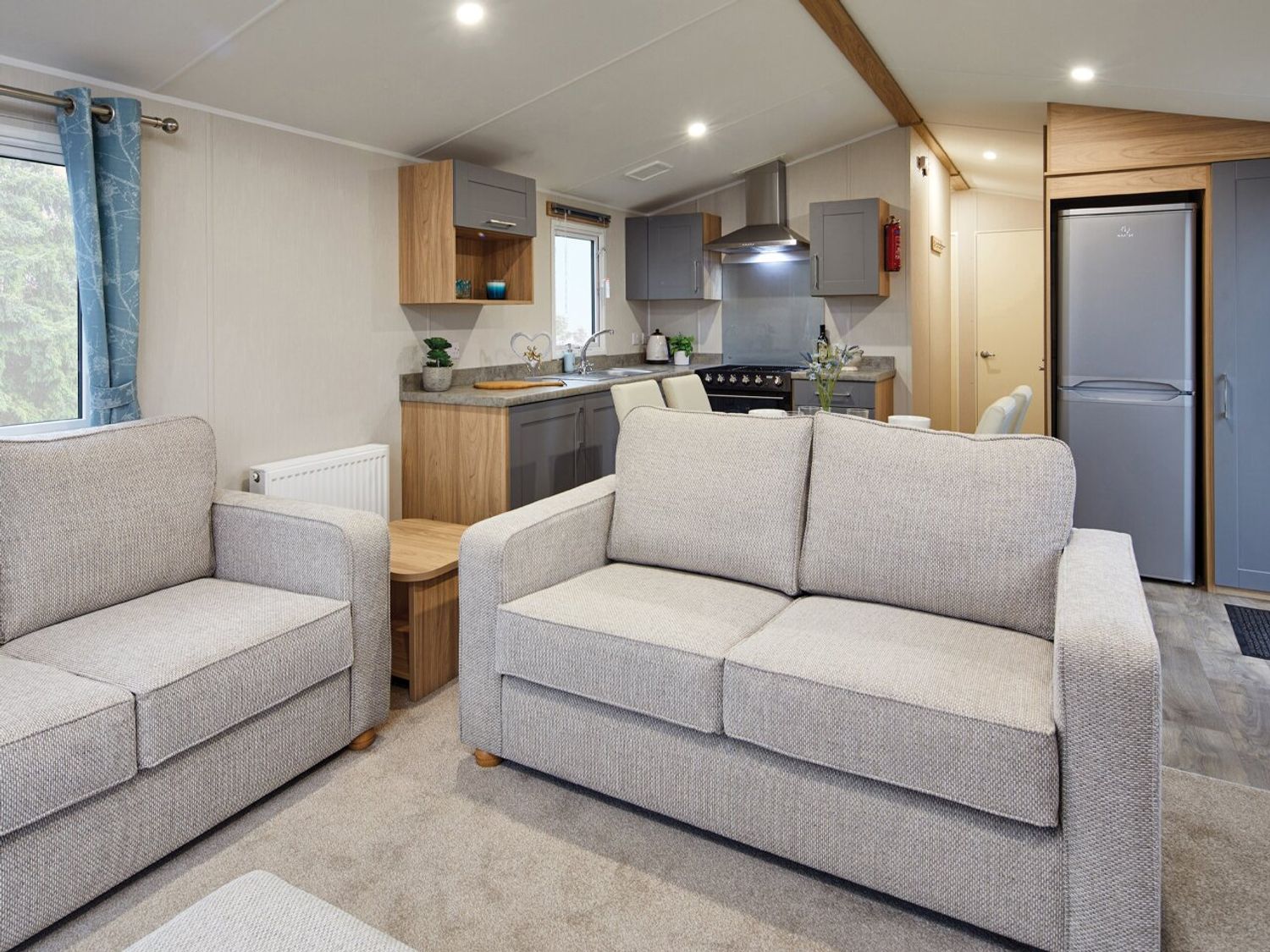 The kitchen, compact yet practical, includes an oven, two-burner hob, microwave, and fridge-freezer, making it easy to prepare meals and snacks.